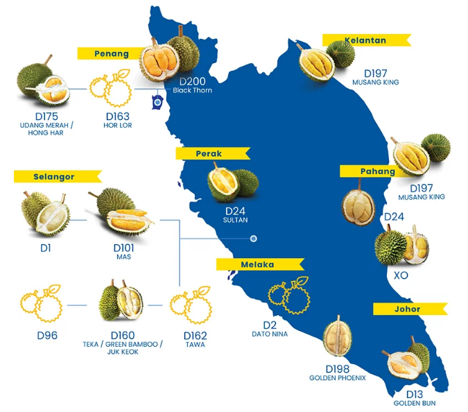 在馬來西亞,大約有200個(gè)榴蓮品種有自己獨(dú)特的風(fēng)味和香氣。同時(shí)它們也對適宜的生長條件也特定的需要,例如降雨,海拔,溫度和土壤結(jié)構(gòu)。榴蓮僅在成熟季節(jié)才有供應(yīng)那發(fā)生在每年的六月和七月。那個(gè)時(shí)節(jié)成熟后從樹上自然掉落的榴蓮,往往會含有較多的果肉和更濃郁的香氣。